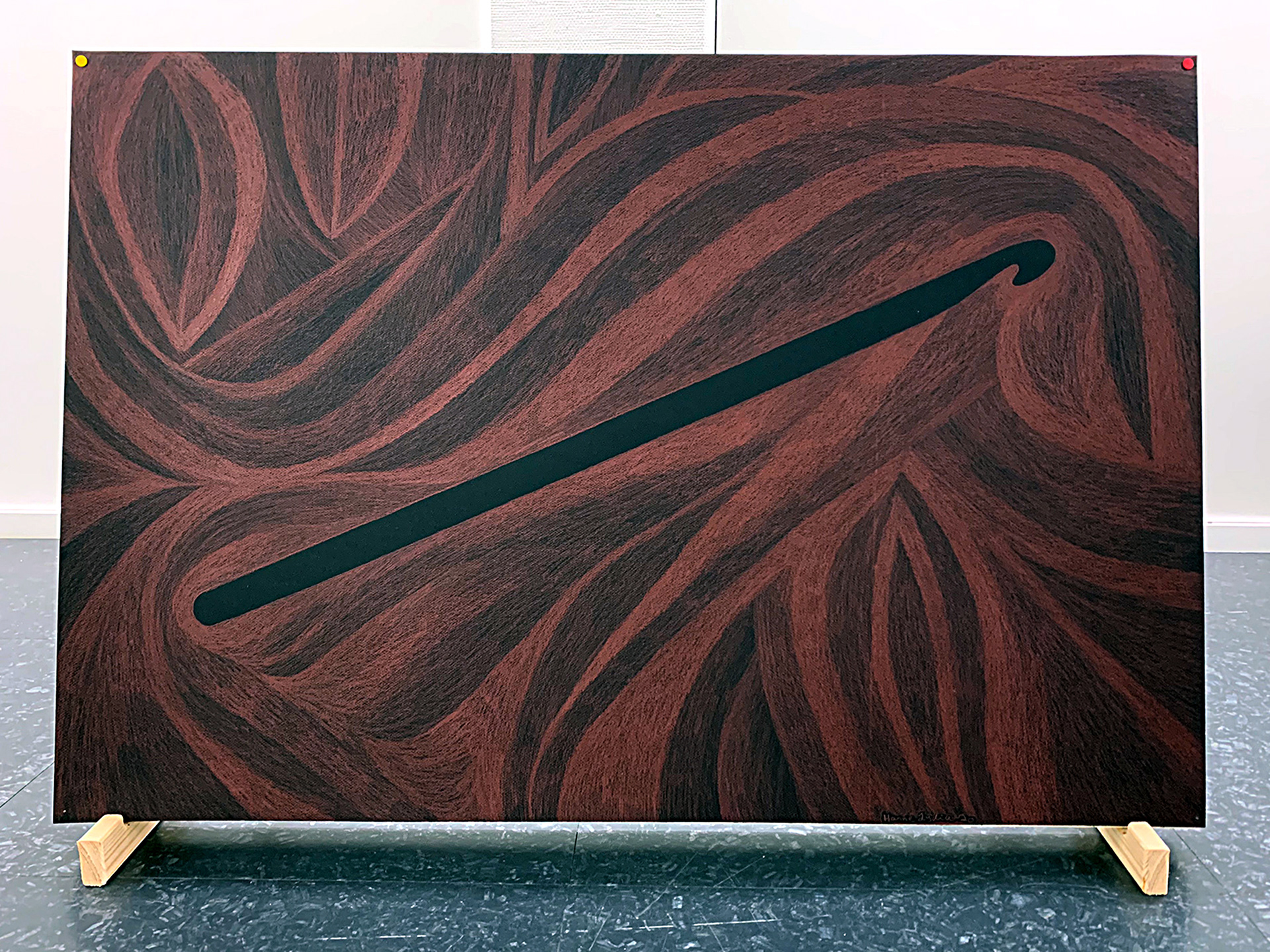 Hold your hangers high! , coloured pencil, bronze, on black paper. H: 180 cm, W: 152 cm. Mounted with pins to wooden stand. 2021.