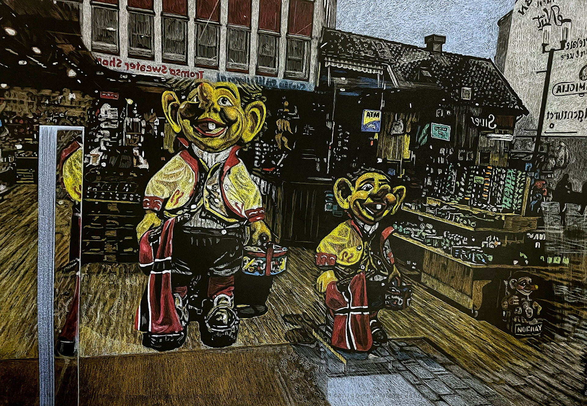 Window Shopping, coloured pencils on black paper, 75 x 110 cm, 2025.