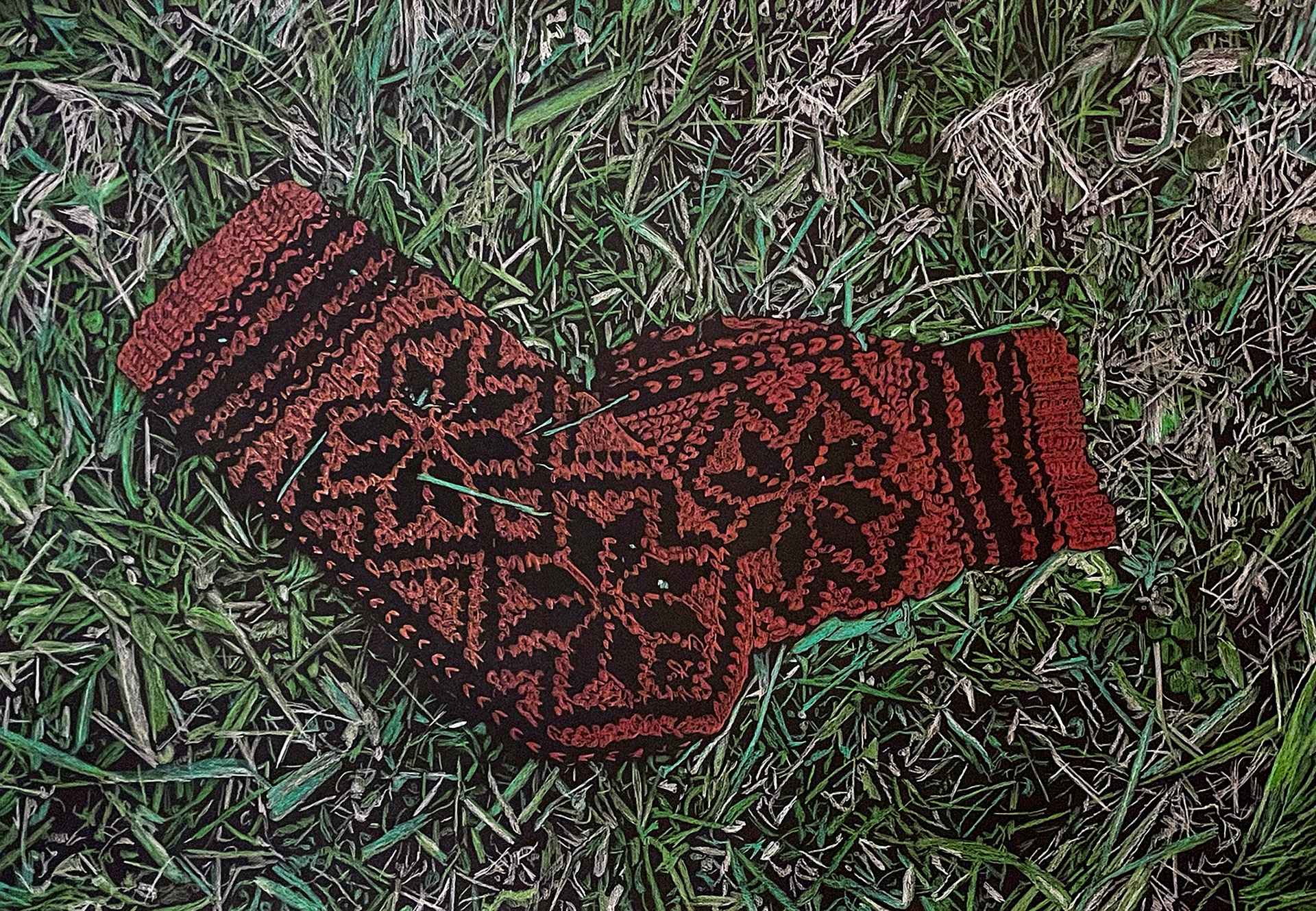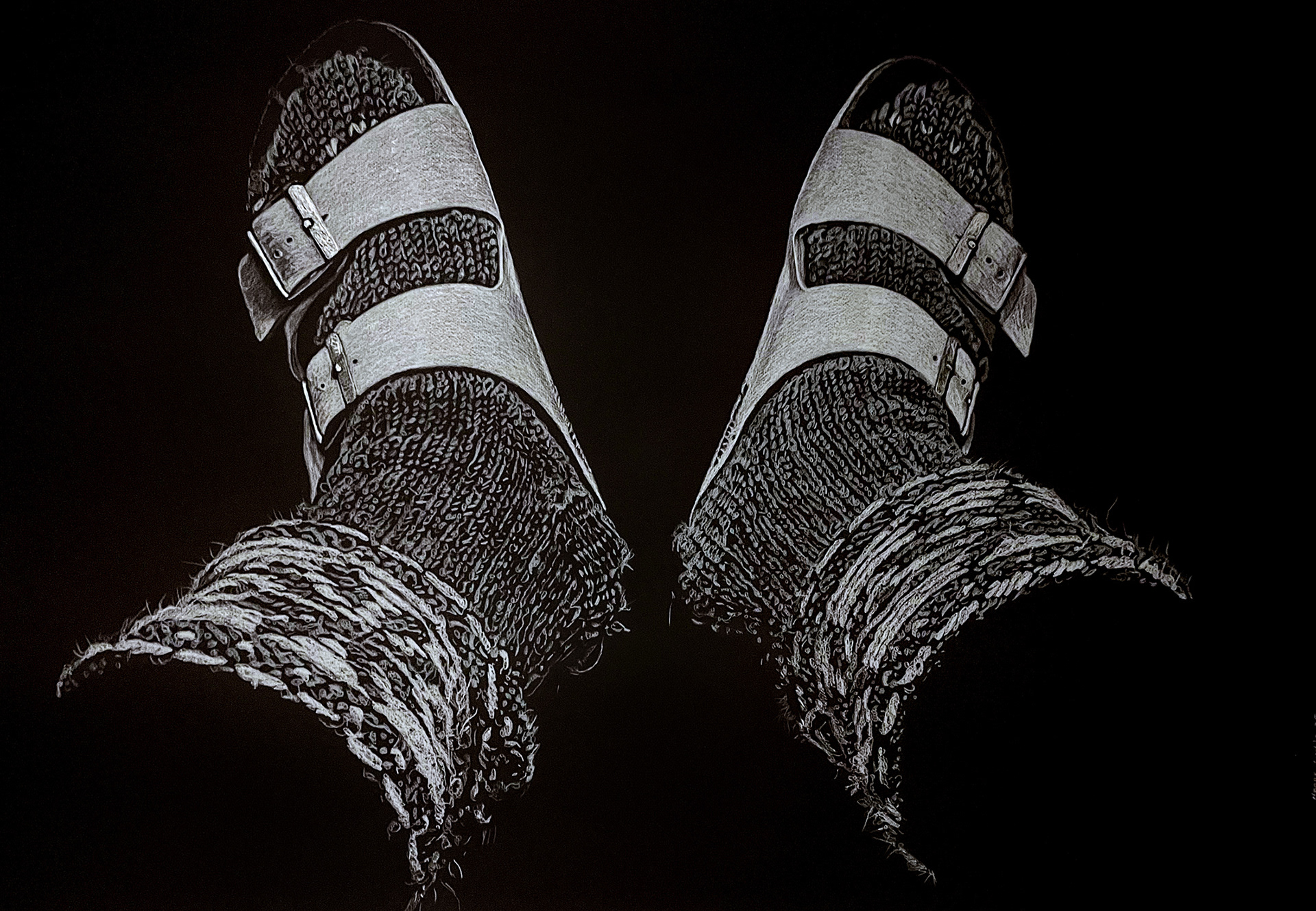 Socks and Sandals, coloured pencils on black paper, 75 x 110 cm, 2024.