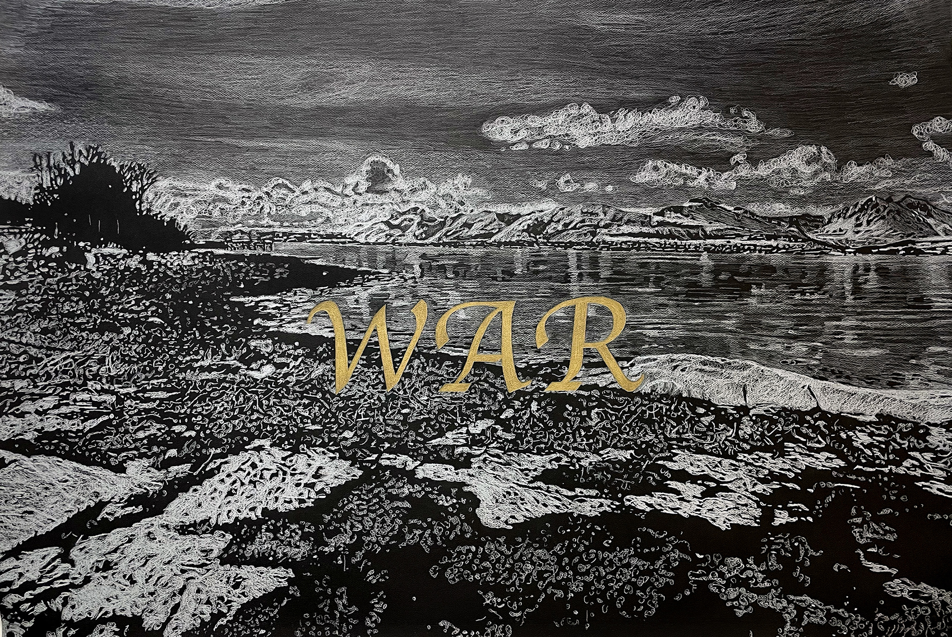 WAR, coloured pencils, gold, on black paper, 75 x 110 cm, 2025.