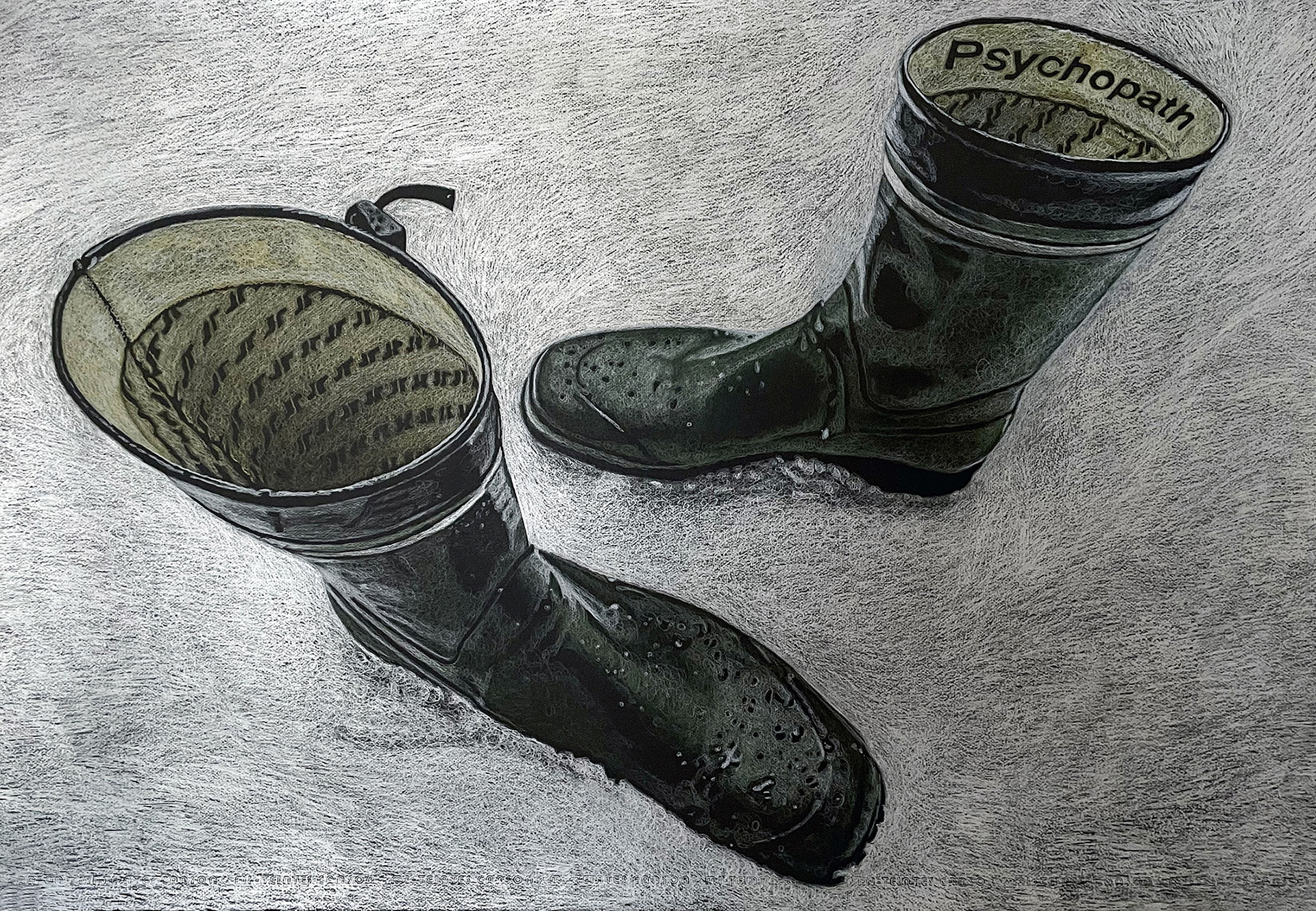 Rubber Boots, coloured pencils, silver, on black paper, 75 x 110 cm, 2025.